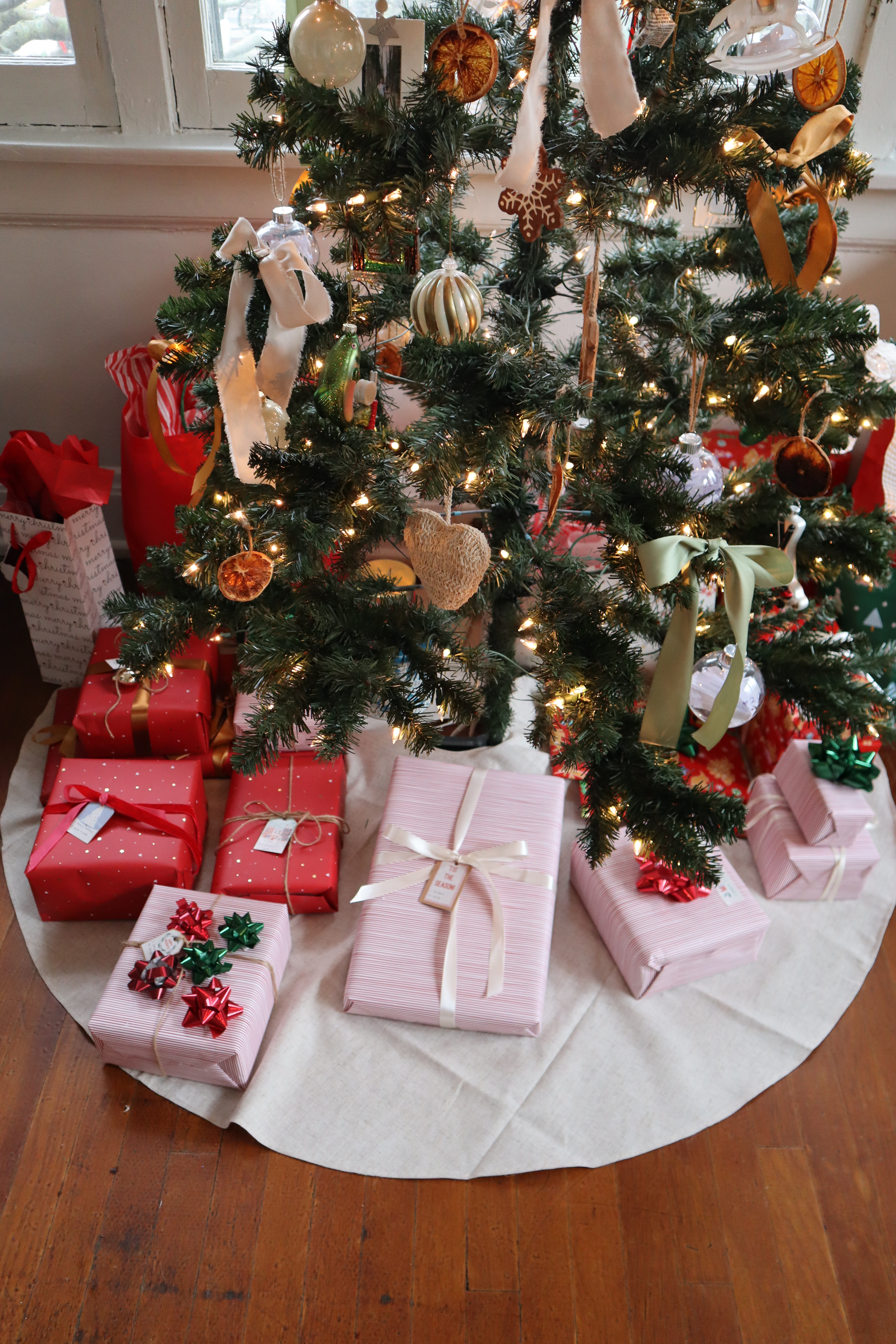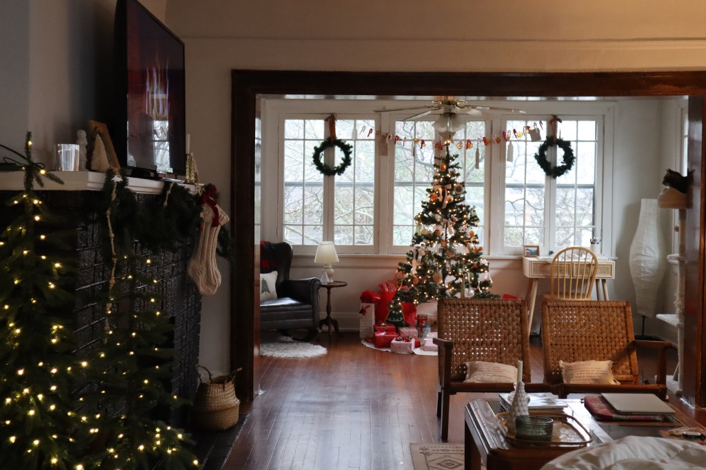 Last year was my first year in this apartment. I bought and collected several pieces that are typical when adding holiday decor to a space (a tree, stockings, throw pillows, etc.). This year I wanted to add more homemade touches to the space that felt more personal to Patrick and me. Most of the additions this year were homemade or purchased second hand. I’m hoping this could provide inspiration when decorating for the holidays. My favorite touches this year were adding bows to the christmas tree, seeing more cultivated travel ornaments, wreaths to frame the tree, and lots of garlands.