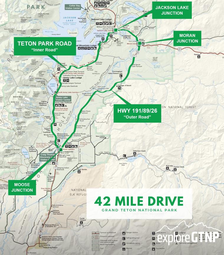 Take a drive on the scenic roads within the park. Grand Teton offers two scenic routes, the outer road, also known as Highway 191 and the inner road, also known as the Teton Park road. See the map below for reference.