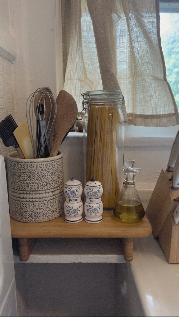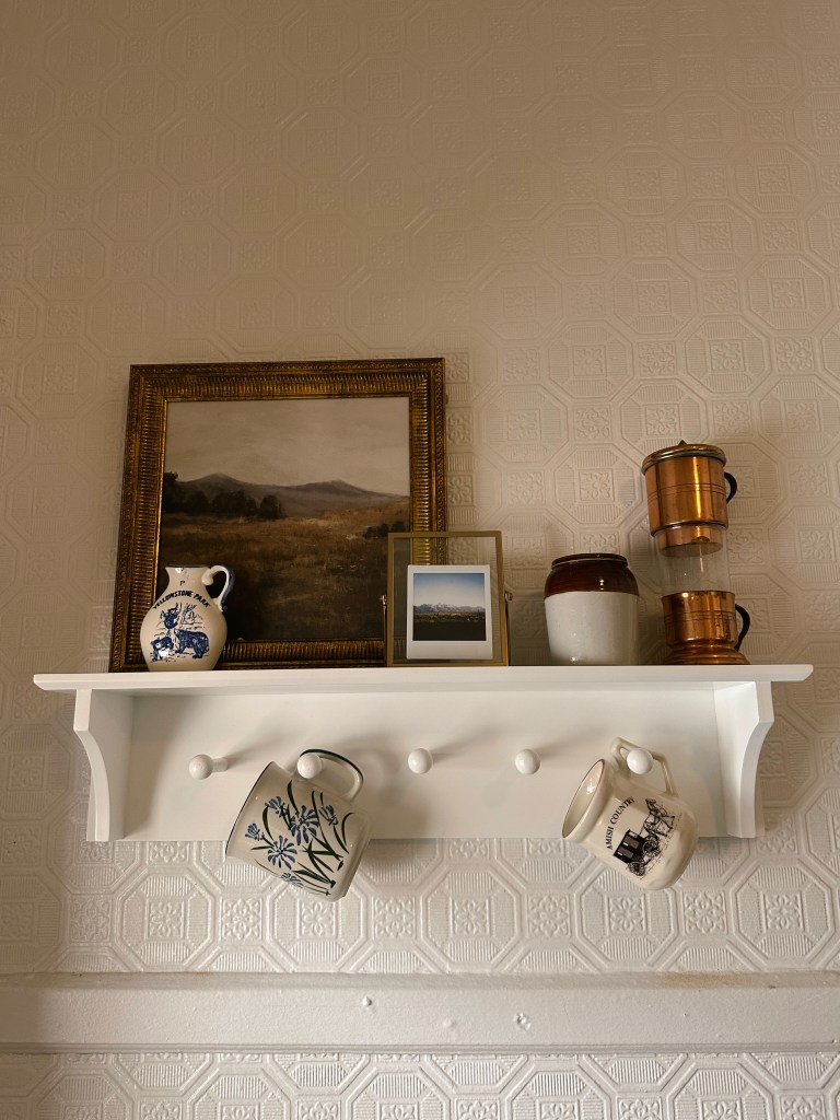 - Rearrange pieces in a new place. I love the shelf I have in our kitchen because it’s fun to change for the seasons! I recently placed some pieces on the shelf that used to be in other spots and it gave the kitchen a fresh look without having to buy something new.